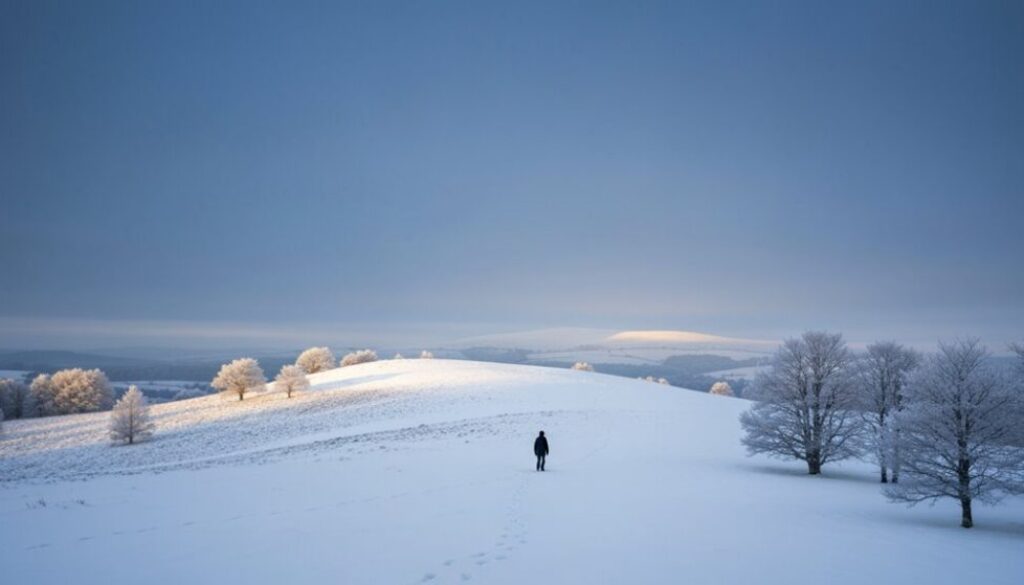 Unter niedrigem Winterlicht bewegt sich ein Wanderer entlang eines schneebedeckten Kamms und begegnet weitläufigen Panoramen, die ferne Wälder, gefrorene Täler und kleine Dörfer zu einem ruhigen, Weitwinkel-Tableau verknüpfen. Die Szene rahmt eine alpine Silhouette am Horizont und einen frostigen Himmel, der sich mit subtilen Wolken und Sonne verändert. Der Blick richtet sich auf Linie und Entfernung: windgeformte Verwehungen, nadelscharfe Grate und Terrassen, geschichtet wie Kapitel der Landschaft. Praktische Hinweise folgen – bei klarer Witterung für gute Sicht wählen, Steigeisen bzw. Mikrospikes und warme Schichten einpacken und den markierten Gratrouten folgen, um verborgene Schluchten zu vermeiden. Fotografen finden lange Aussichtspunkte ideal in der goldenen Stunde; Gelegenheitwanderer schätzen die beruhigende Weite. Kammrouten belohnen gleichmäßiges Tempo und bieten weite Perspektive ohne technisches Klettern.